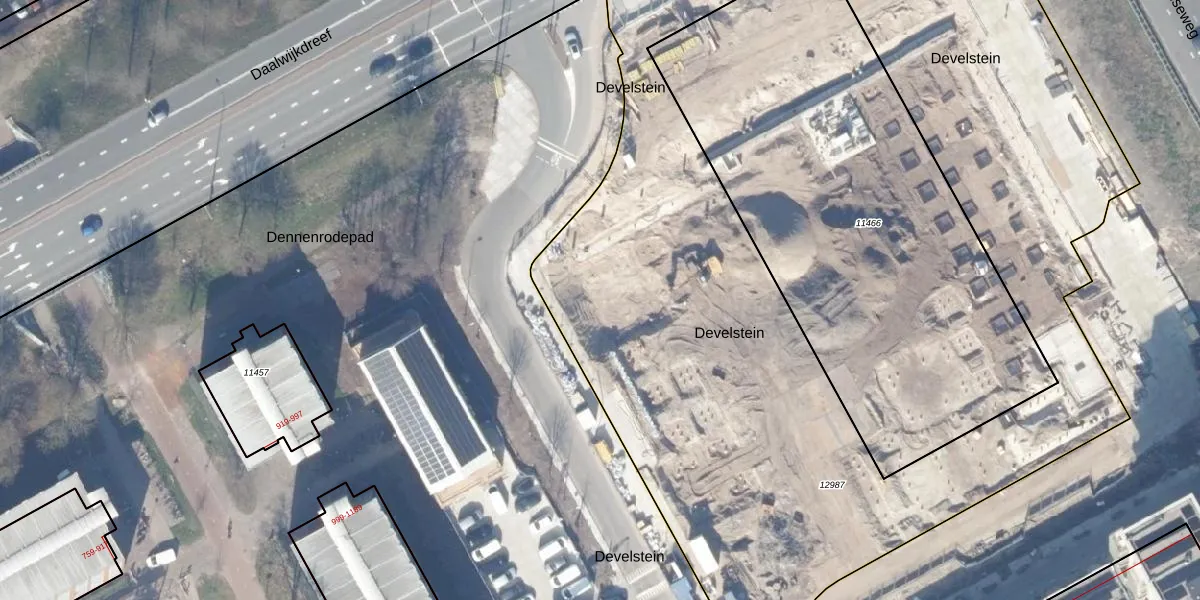 Het perceel waarop Develstein 2-C staat heeft een oppervlakte van 5873 m². Dit is een zeer groot perceel. De perceeloppervlakte wordt geregistreerd door het Kadaster. Gedetailleerde informatie over de maten van dit perceel kunt u vinden in het rapport Kadastrale kaart met maatvoering van Develstein 2-C.