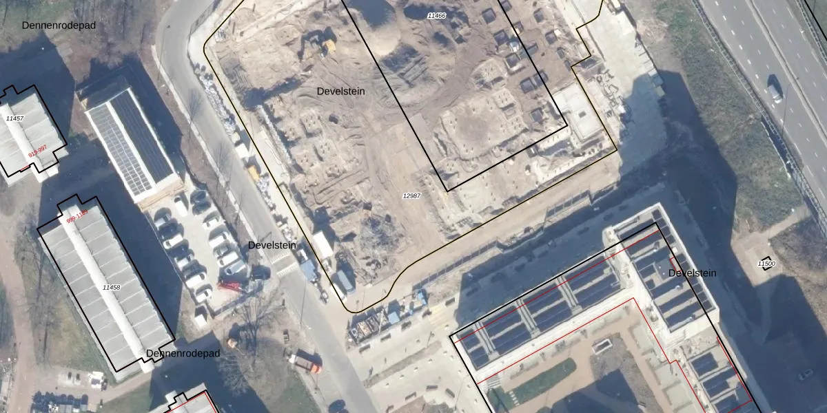 Het perceel waarop Develstein 54-A staat heeft een oppervlakte van 5873 m². Dit is een zeer groot perceel. De perceeloppervlakte wordt geregistreerd door het Kadaster. Gedetailleerde informatie over de maten van dit perceel kunt u vinden in het rapport Kadastrale kaart met maatvoering van Develstein 54-A.
