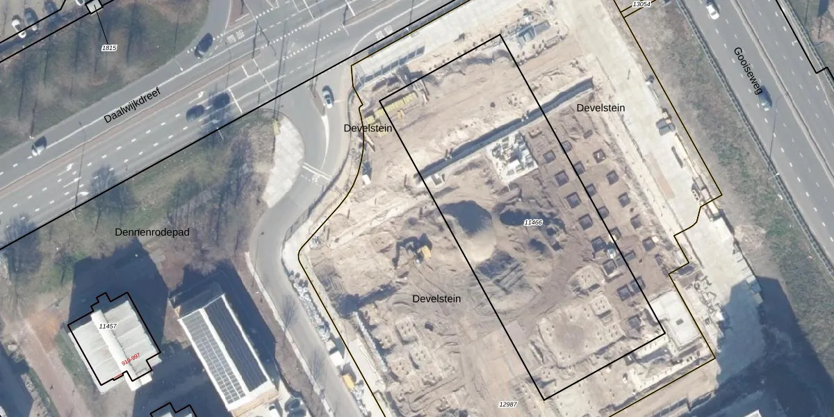Het perceel waarop Develstein 66-A staat heeft een oppervlakte van 5873 m². Dit is een zeer groot perceel. De perceeloppervlakte wordt geregistreerd door het Kadaster. Gedetailleerde informatie over de maten van dit perceel kunt u vinden in het rapport Kadastrale kaart met maatvoering van Develstein 66-A.