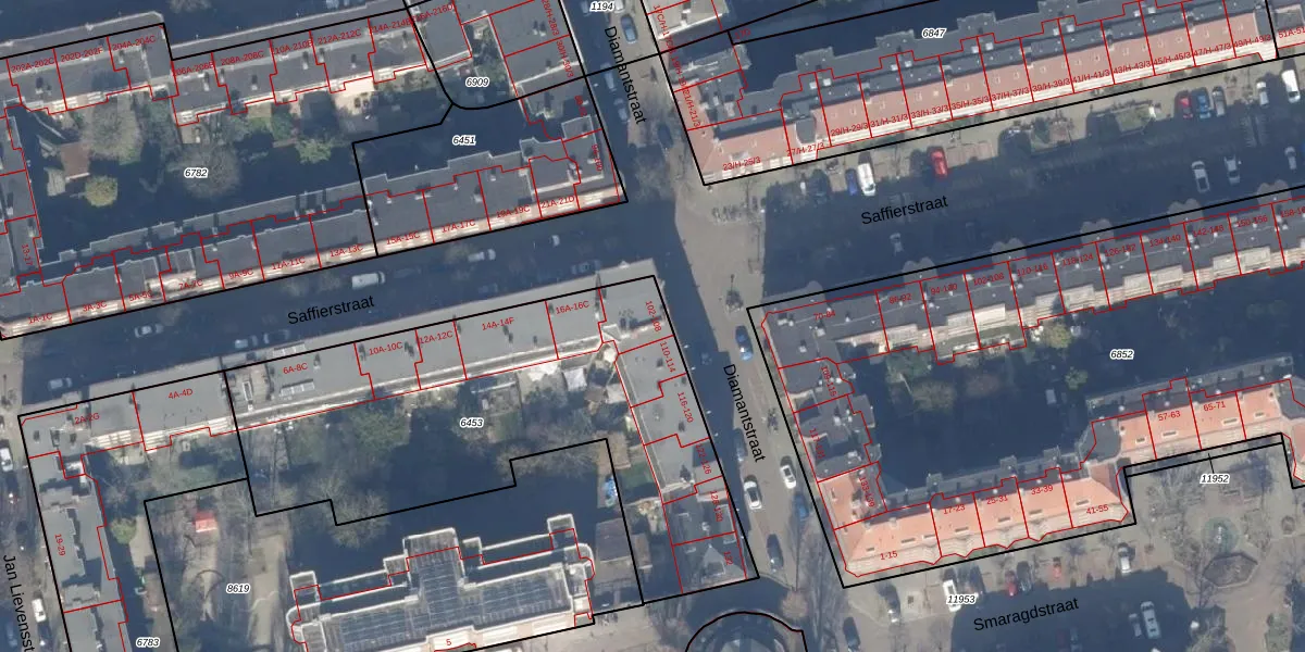 Diamantstraat 106 is gelegen op kadastraal perceel ASD18V6453. Deze kadastrale aanduiding is uniek en wordt gebruikt door het Kadaster om eigendomsrechten en andere zakelijke rechten vast te leggen. Het perceel maakt onderdeel uit van de kadastrale gemeente Amsterdam.