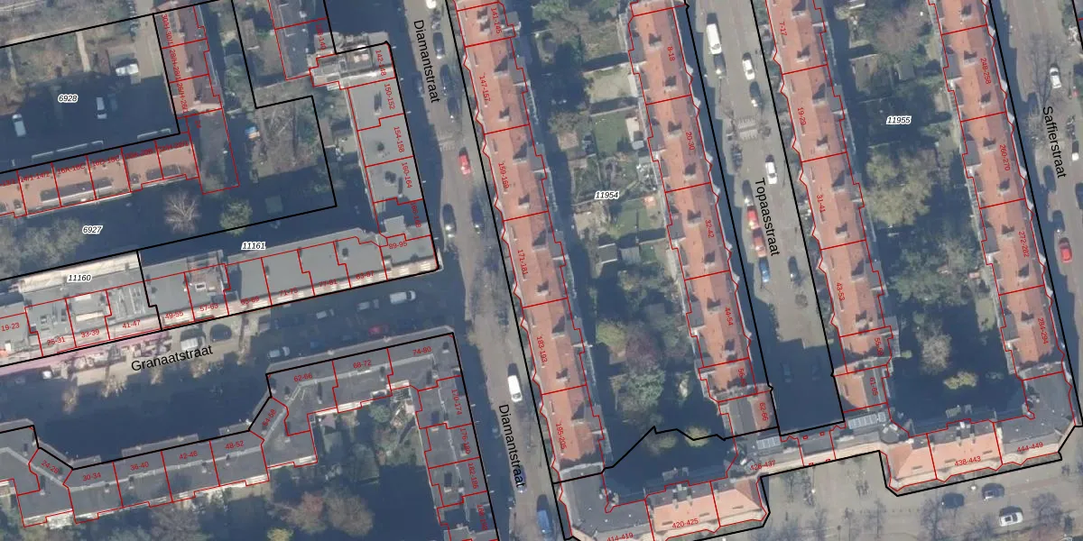 Het perceel waarop Diamantstraat 177 staat heeft een oppervlakte van 4395 m². Dit is een zeer groot perceel. De perceeloppervlakte wordt geregistreerd door het Kadaster. Gedetailleerde informatie over de maten van dit perceel kunt u vinden in het rapport Kadastrale kaart met maatvoering van Diamantstraat 177.
