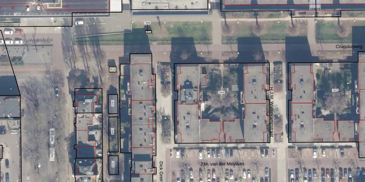 Dick Greinerstraat 84 is gelegen op kadastraal perceel ASD02A7404. Deze kadastrale aanduiding is uniek en wordt gebruikt door het Kadaster om eigendomsrechten en andere zakelijke rechten vast te leggen. Het perceel maakt onderdeel uit van de kadastrale gemeente Amsterdam.