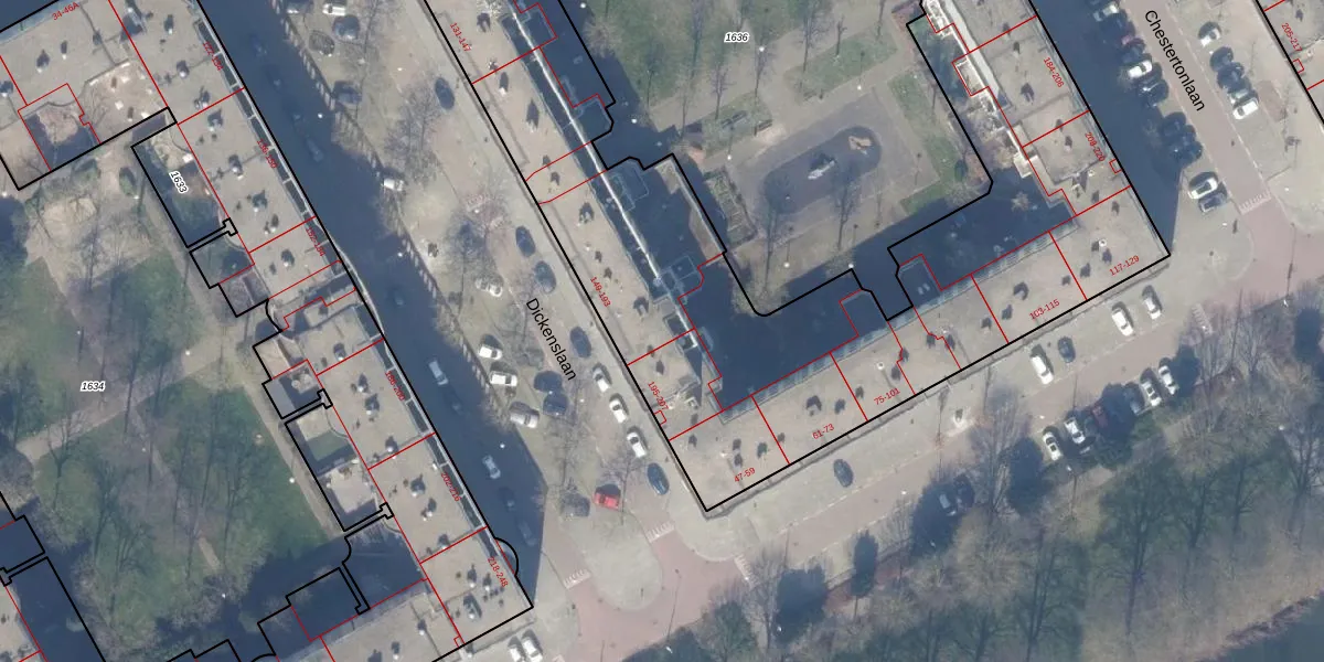 Het perceel waarop Dickenslaan 187 staat heeft een oppervlakte van 5723 m². Dit is een zeer groot perceel. De perceeloppervlakte wordt geregistreerd door het Kadaster. Gedetailleerde informatie over de maten van dit perceel kunt u vinden in het rapport Kadastrale kaart met maatvoering van Dickenslaan 187.