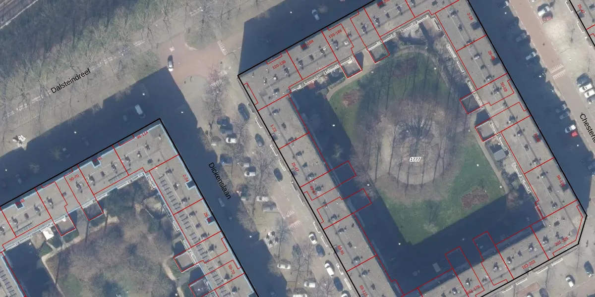 Het perceel waarop Dickenslaan 27 staat heeft een oppervlakte van 8340 m². Dit is een zeer groot perceel. De perceeloppervlakte wordt geregistreerd door het Kadaster. Gedetailleerde informatie over de maten van dit perceel kunt u vinden in het rapport Kadastrale kaart met maatvoering van Dickenslaan 27.
