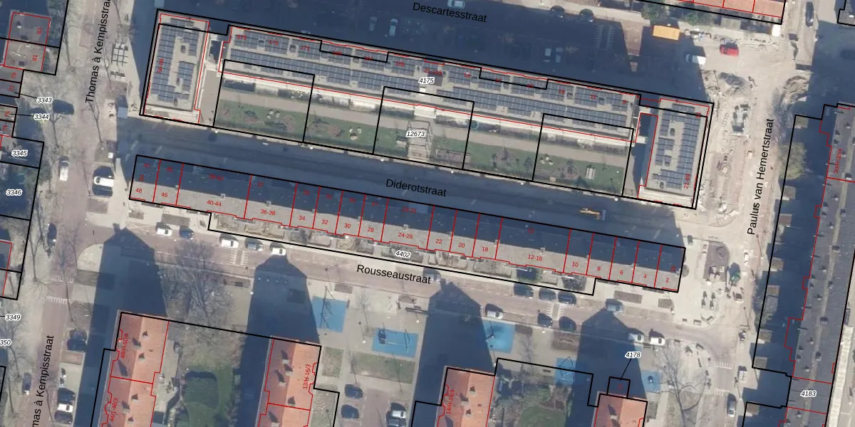 Het perceel waarop Diderotstraat 23 staat heeft een oppervlakte van 1734 m². Dit is een zeer groot perceel. De perceeloppervlakte wordt geregistreerd door het Kadaster. Gedetailleerde informatie over de maten van dit perceel kunt u vinden in het rapport Kadastrale kaart met maatvoering van Diderotstraat 23.