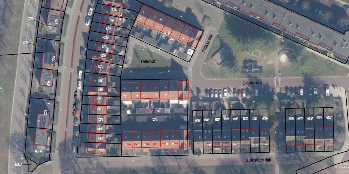Het perceel waarop Dillehof 2 staat heeft een oppervlakte van 1679 m². Dit is een zeer groot perceel. De perceeloppervlakte wordt geregistreerd door het Kadaster. Gedetailleerde informatie over de maten van dit perceel kunt u vinden in het rapport Kadastrale kaart met maatvoering van Dillehof 2.