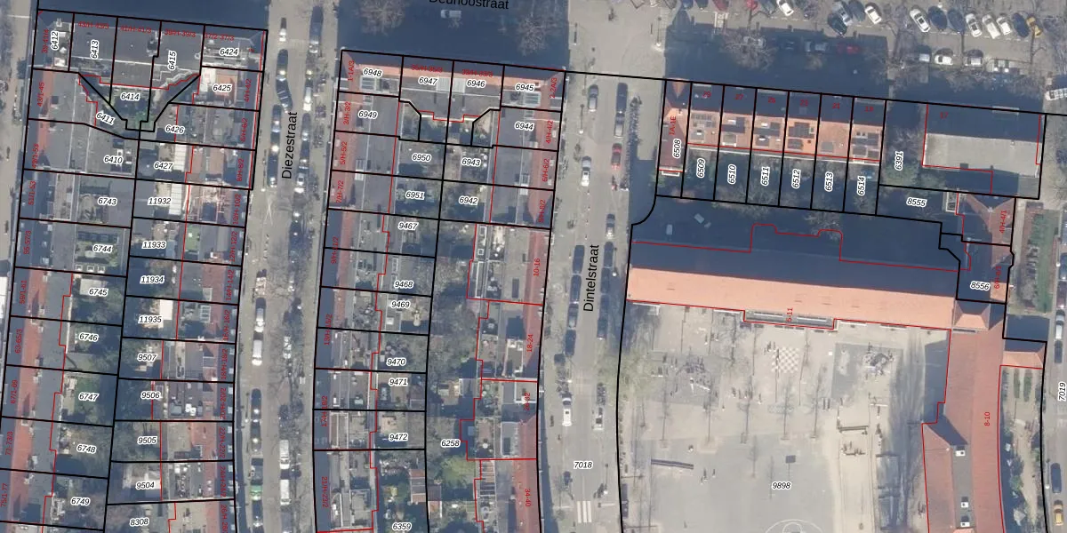 Het perceel waarop Dintelstraat 12-1 staat heeft een oppervlakte van 1720 m². Dit is een zeer groot perceel. De perceeloppervlakte wordt geregistreerd door het Kadaster. Gedetailleerde informatie over de maten van dit perceel kunt u vinden in het rapport Kadastrale kaart met maatvoering van Dintelstraat 12-1.