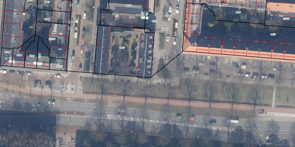 Dintelstraat 174 is gelegen op kadastraal perceel ASD18V7873. Deze kadastrale aanduiding is uniek en wordt gebruikt door het Kadaster om eigendomsrechten en andere zakelijke rechten vast te leggen. Het perceel maakt onderdeel uit van de kadastrale gemeente Amsterdam.