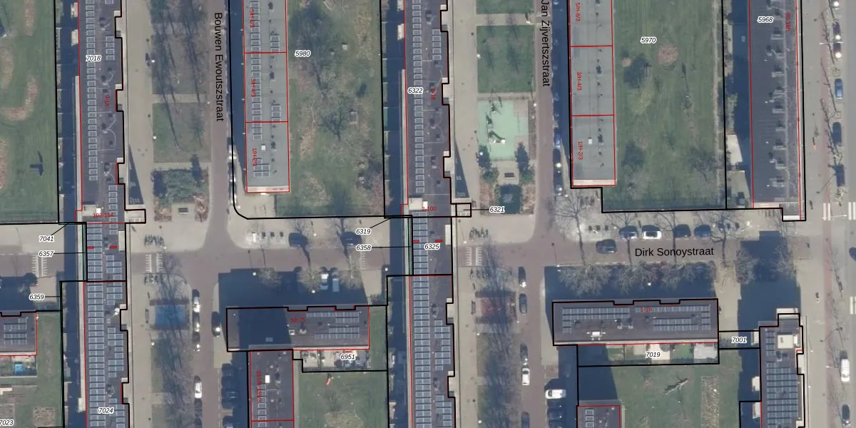 Het perceel waarop Dirk Sonoystraat 22 staat heeft een oppervlakte van 900 m². Dit is een groot perceel. De perceeloppervlakte wordt geregistreerd door het Kadaster. Gedetailleerde informatie over de maten van dit perceel kunt u vinden in het rapport Kadastrale kaart met maatvoering van Dirk Sonoystraat 22.