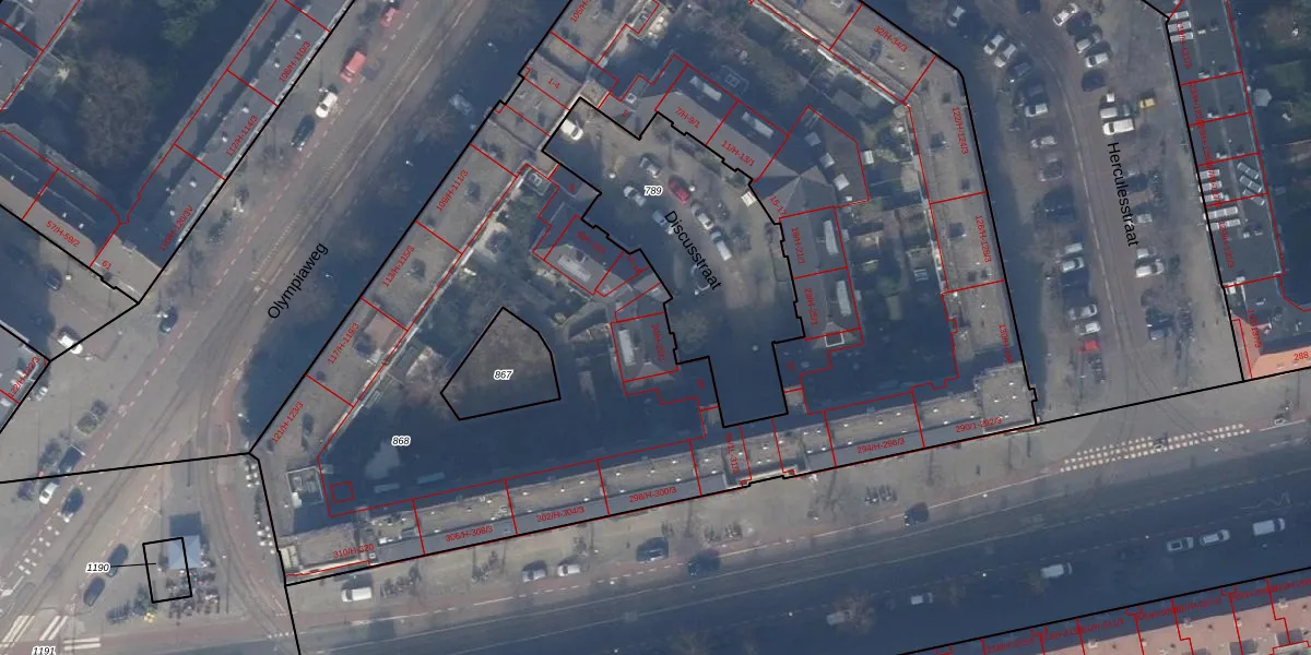 Het adres is gelegen op perceel 868 in de sectie AC en de kadastrale gemeente Amsterdam. De kadastrale aanduiding is aldus ASD24-AC-868. Het perceel is met 6395 m² relatief groot. Het gemiddelde ligt in de kadastrale gemeente Amsterdam op 1365,99 m². Het kleinste perceel in de kadastrale gemeente is 1 m² groot. De grootste perceeloppervlakte is 11,7 ha. Op het perceel zijn 202 adressen aanwezig. In de Basisregistratie Kadaster (BRK) werden de grenzen van het perceel geregistreerd op 30-11-2010.
