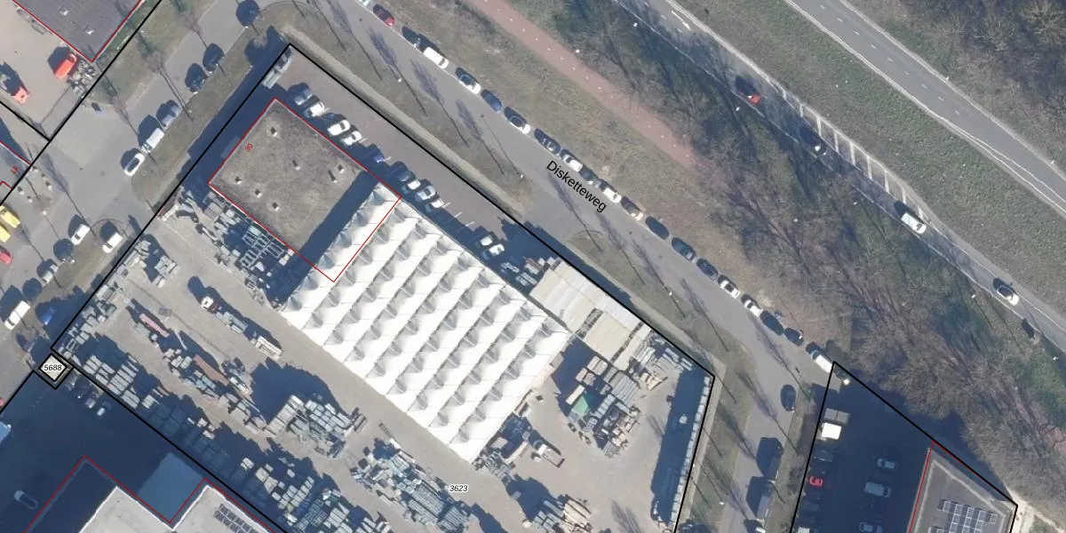 Het perceel waarop Disketteweg 152 staat heeft een oppervlakte van 8566 m². Dit is een zeer groot perceel. De perceeloppervlakte wordt geregistreerd door het Kadaster. Gedetailleerde informatie over de maten van dit perceel kunt u vinden in het rapport Kadastrale kaart met maatvoering van Disketteweg 152.