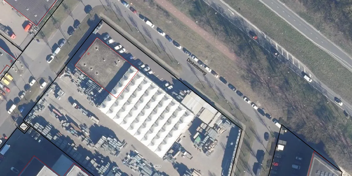 Het perceel waarop Disketteweg 154 staat heeft een oppervlakte van 8566 m². Dit is een zeer groot perceel. De perceeloppervlakte wordt geregistreerd door het Kadaster. Gedetailleerde informatie over de maten van dit perceel kunt u vinden in het rapport Kadastrale kaart met maatvoering van Disketteweg 154.