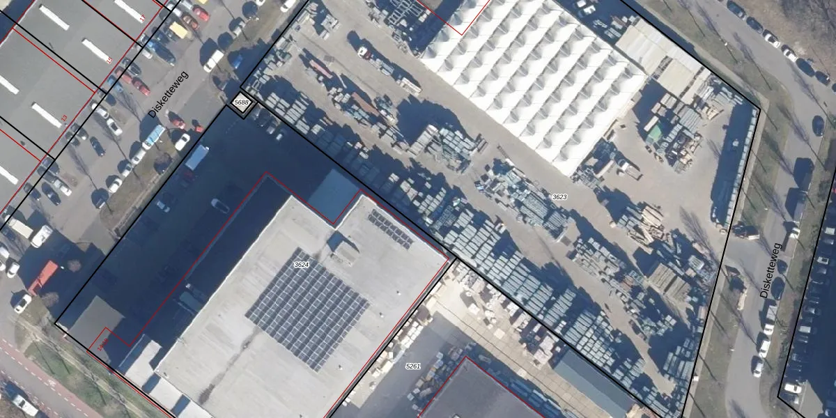 Het perceel waarop Disketteweg 40 staat heeft een oppervlakte van 8566 m². Dit is een zeer groot perceel. De perceeloppervlakte wordt geregistreerd door het Kadaster. Gedetailleerde informatie over de maten van dit perceel kunt u vinden in het rapport Kadastrale kaart met maatvoering van Disketteweg 40.