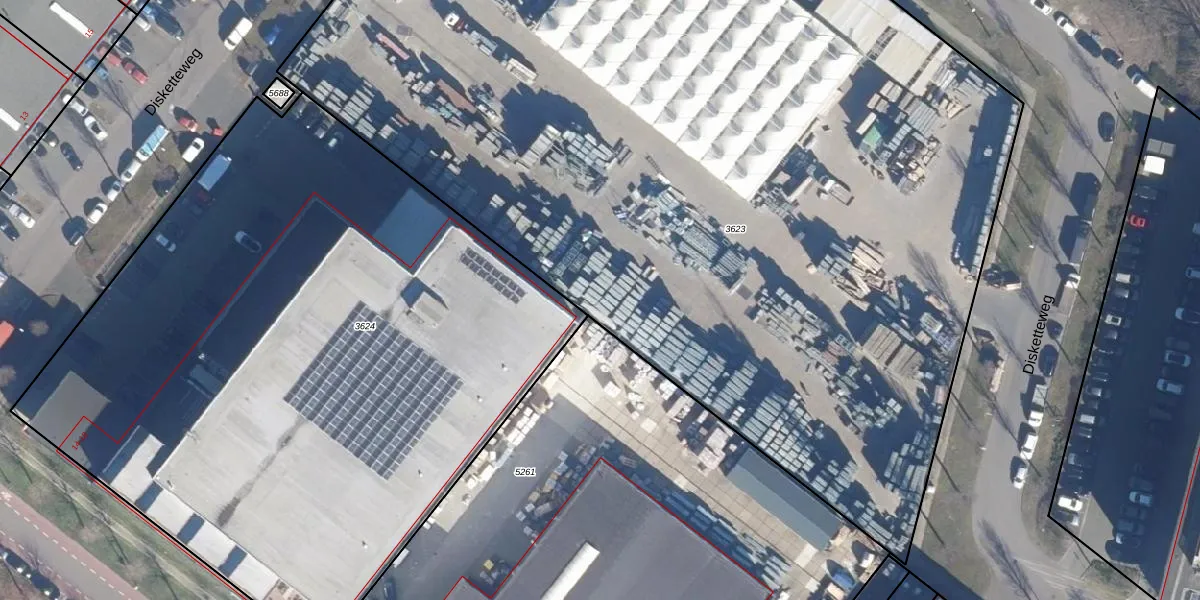Het perceel waarop Disketteweg 44 staat heeft een oppervlakte van 8566 m². Dit is een zeer groot perceel. De perceeloppervlakte wordt geregistreerd door het Kadaster. Gedetailleerde informatie over de maten van dit perceel kunt u vinden in het rapport Kadastrale kaart met maatvoering van Disketteweg 44.