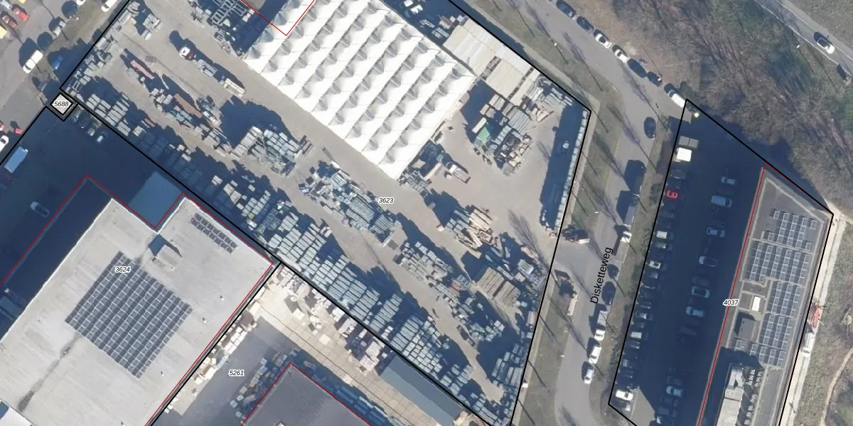 Het perceel waarop Disketteweg 74 staat heeft een oppervlakte van 8566 m². Dit is een zeer groot perceel. De perceeloppervlakte wordt geregistreerd door het Kadaster. Gedetailleerde informatie over de maten van dit perceel kunt u vinden in het rapport Kadastrale kaart met maatvoering van Disketteweg 74.