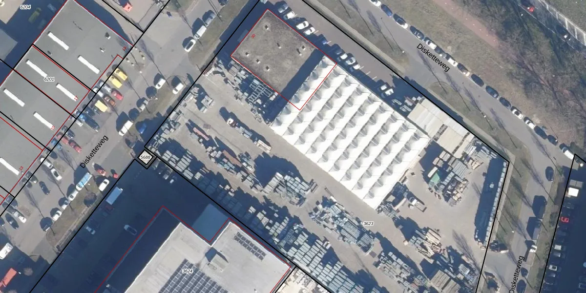 Het perceel waarop Disketteweg 90 staat heeft een oppervlakte van 8566 m². Dit is een zeer groot perceel. De perceeloppervlakte wordt geregistreerd door het Kadaster. Gedetailleerde informatie over de maten van dit perceel kunt u vinden in het rapport Kadastrale kaart met maatvoering van Disketteweg 90.