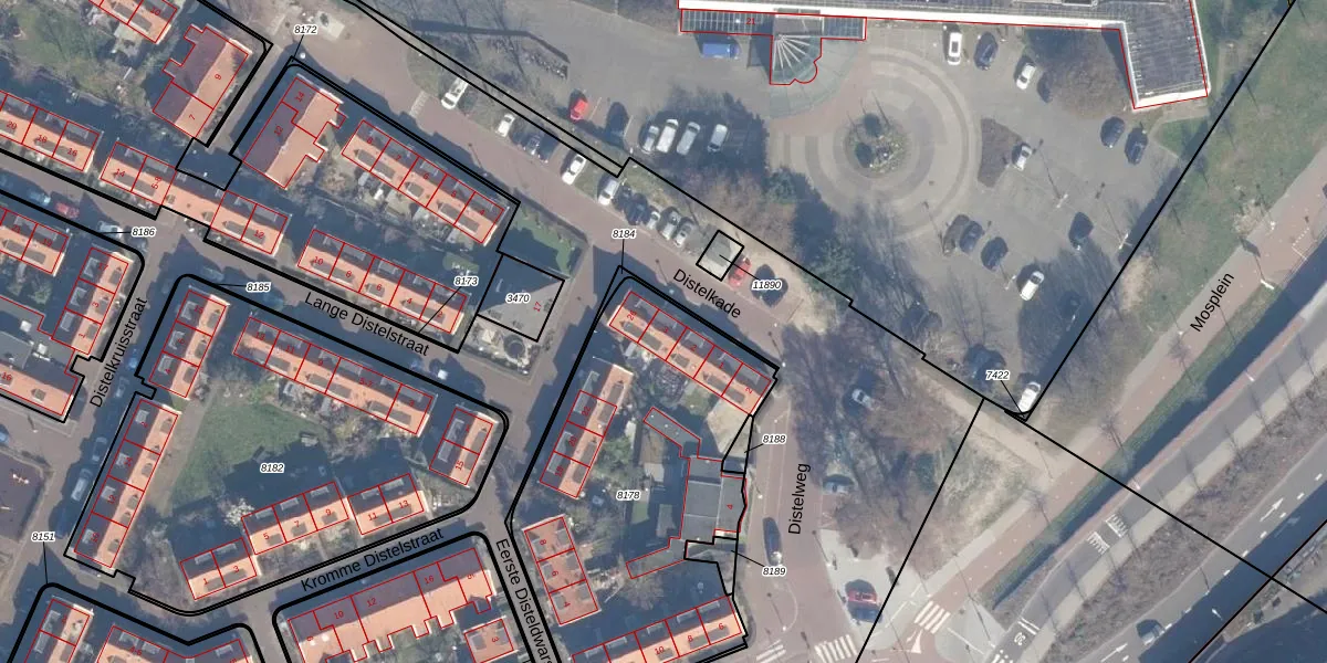 Het perceel waarop Distelkade 3 staat heeft een oppervlakte van 1630 m². Dit is een zeer groot perceel. De perceeloppervlakte wordt geregistreerd door het Kadaster. Gedetailleerde informatie over de maten van dit perceel kunt u vinden in het rapport Kadastrale kaart met maatvoering van Distelkade 3.