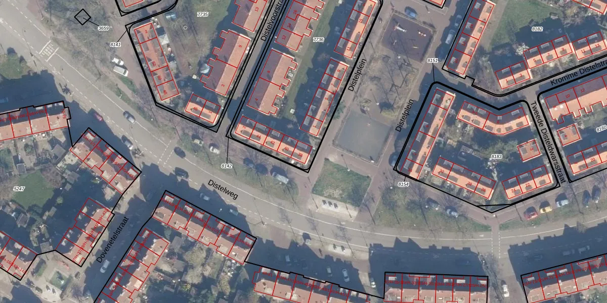 Distelweg 38 is gelegen op kadastraal perceel ASD07K7736. Deze kadastrale aanduiding is uniek en wordt gebruikt door het Kadaster om eigendomsrechten en andere zakelijke rechten vast te leggen. Het perceel maakt onderdeel uit van de kadastrale gemeente Amsterdam.