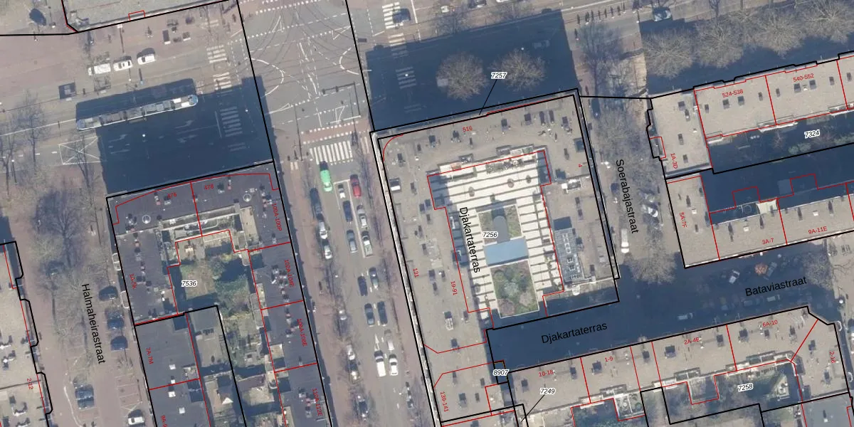 Het perceel waarop Djakartaterras 52 staat heeft een oppervlakte van 2622 m². Dit is een zeer groot perceel. De perceeloppervlakte wordt geregistreerd door het Kadaster. Gedetailleerde informatie over de maten van dit perceel kunt u vinden in het rapport Kadastrale kaart met maatvoering van Djakartaterras 52.