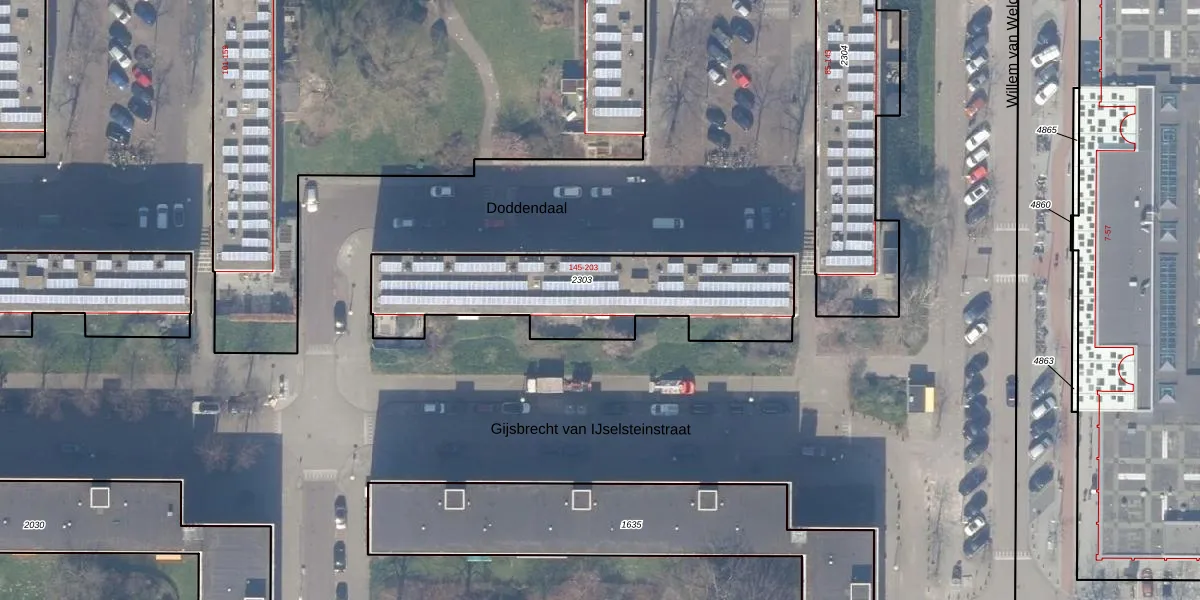 Doddendaal 171 is gelegen op kadastraal perceel ASD30AK2303. Deze kadastrale aanduiding is uniek en wordt gebruikt door het Kadaster om eigendomsrechten en andere zakelijke rechten vast te leggen. Het perceel maakt onderdeel uit van de kadastrale gemeente Amsterdam.