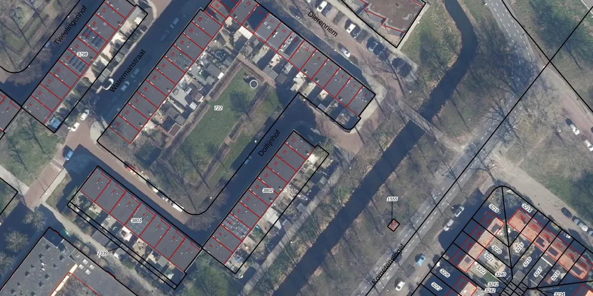 Het perceel waarop Dolfijnhof 17 staat heeft een oppervlakte van 730 m². Dit is een groot perceel. De perceeloppervlakte wordt geregistreerd door het Kadaster. Gedetailleerde informatie over de maten van dit perceel kunt u vinden in het rapport Kadastrale kaart met maatvoering van Dolfijnhof 17.