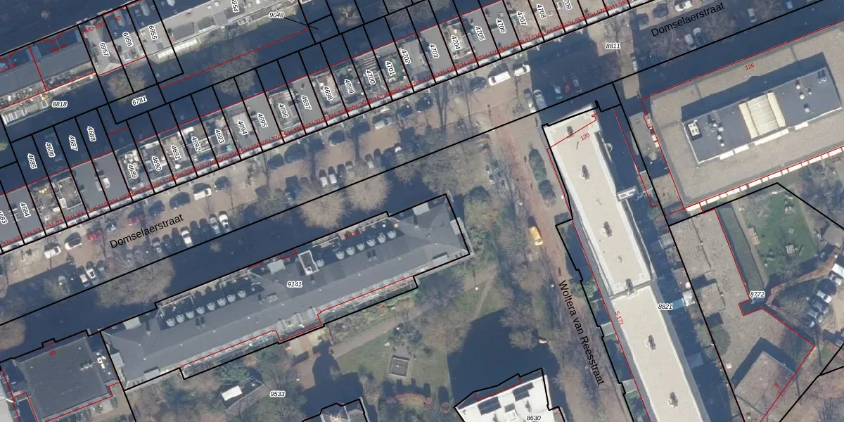 Domselaerstraat 102 is gelegen op kadastraal perceel ASD15S9141. Deze kadastrale aanduiding is uniek en wordt gebruikt door het Kadaster om eigendomsrechten en andere zakelijke rechten vast te leggen. Het perceel maakt onderdeel uit van de kadastrale gemeente Amsterdam.