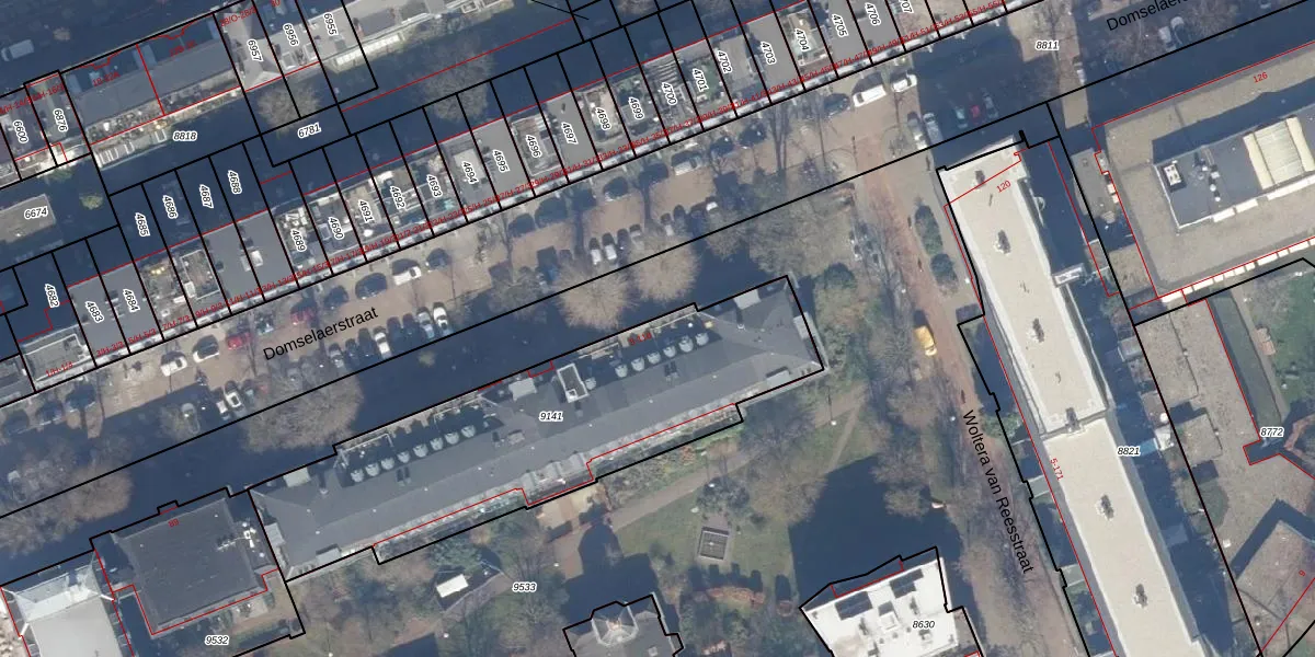 Het perceel waarop Domselaerstraat 76 staat heeft een oppervlakte van 1608 m². Dit is een zeer groot perceel. De perceeloppervlakte wordt geregistreerd door het Kadaster. Gedetailleerde informatie over de maten van dit perceel kunt u vinden in het rapport Kadastrale kaart met maatvoering van Domselaerstraat 76.