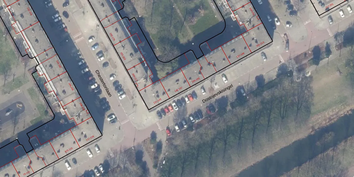 Het perceel waarop Dostojevskisingel 155 staat heeft een oppervlakte van 5569 m². Dit is een zeer groot perceel. De perceeloppervlakte wordt geregistreerd door het Kadaster. Gedetailleerde informatie over de maten van dit perceel kunt u vinden in het rapport Kadastrale kaart met maatvoering van Dostojevskisingel 155.