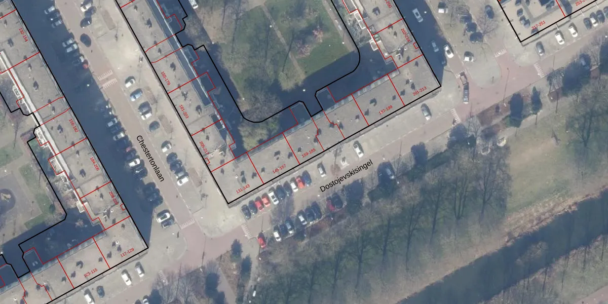Het perceel waarop Dostojevskisingel 163 staat heeft een oppervlakte van 5569 m². Dit is een zeer groot perceel. De perceeloppervlakte wordt geregistreerd door het Kadaster. Gedetailleerde informatie over de maten van dit perceel kunt u vinden in het rapport Kadastrale kaart met maatvoering van Dostojevskisingel 163.