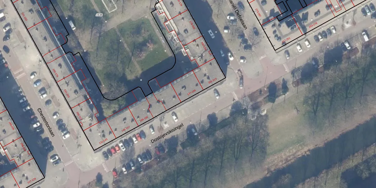Het perceel waarop Dostojevskisingel 193 staat heeft een oppervlakte van 5569 m². Dit is een zeer groot perceel. De perceeloppervlakte wordt geregistreerd door het Kadaster. Gedetailleerde informatie over de maten van dit perceel kunt u vinden in het rapport Kadastrale kaart met maatvoering van Dostojevskisingel 193.