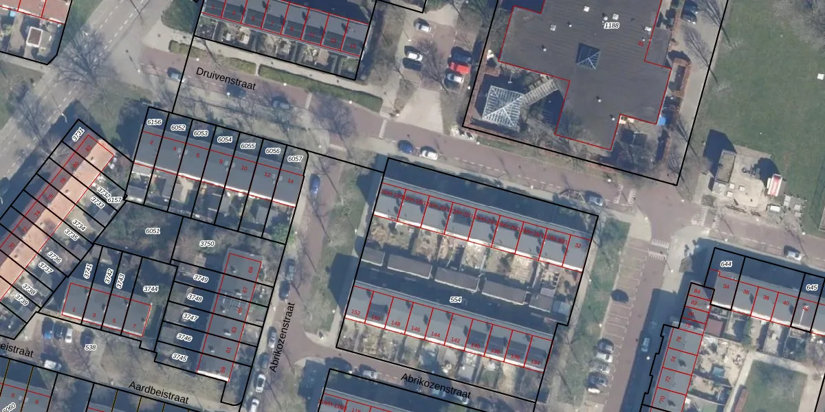 Het perceel waarop Druivenstraat 18-H staat heeft een oppervlakte van 2468 m². Dit is een zeer groot perceel. De perceeloppervlakte wordt geregistreerd door het Kadaster. Gedetailleerde informatie over de maten van dit perceel kunt u vinden in het rapport Kadastrale kaart met maatvoering van Druivenstraat 18-H.