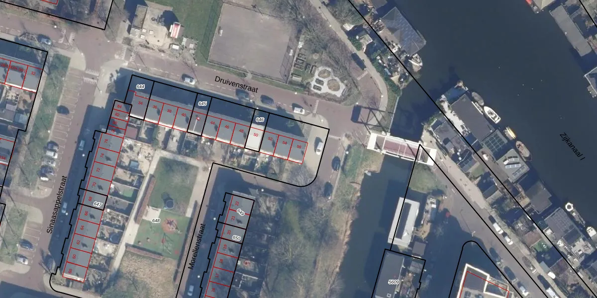 Druivenstraat 56 is gelegen op kadastraal perceel ASD28AH648. Deze kadastrale aanduiding is uniek en wordt gebruikt door het Kadaster om eigendomsrechten en andere zakelijke rechten vast te leggen. Het perceel maakt onderdeel uit van de kadastrale gemeente Amsterdam.