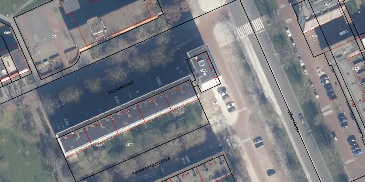 Het perceel waarop Duinluststraat 107 staat heeft een oppervlakte van 2112 m². Dit is een zeer groot perceel. De perceeloppervlakte wordt geregistreerd door het Kadaster. Gedetailleerde informatie over de maten van dit perceel kunt u vinden in het rapport Kadastrale kaart met maatvoering van Duinluststraat 107.