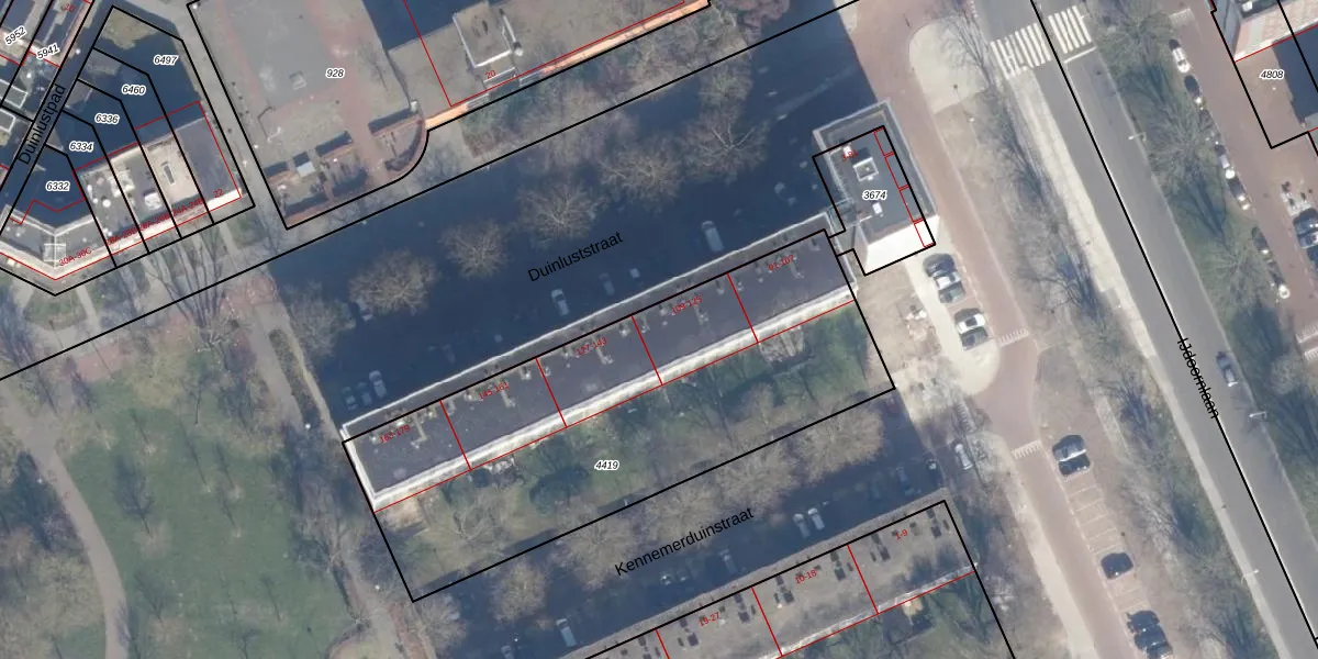 Het perceel waarop Duinluststraat 111 staat heeft een oppervlakte van 2112 m². Dit is een zeer groot perceel. De perceeloppervlakte wordt geregistreerd door het Kadaster. Gedetailleerde informatie over de maten van dit perceel kunt u vinden in het rapport Kadastrale kaart met maatvoering van Duinluststraat 111.