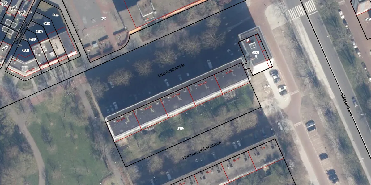 Het perceel waarop Duinluststraat 127 staat heeft een oppervlakte van 2112 m². Dit is een zeer groot perceel. De perceeloppervlakte wordt geregistreerd door het Kadaster. Gedetailleerde informatie over de maten van dit perceel kunt u vinden in het rapport Kadastrale kaart met maatvoering van Duinluststraat 127.