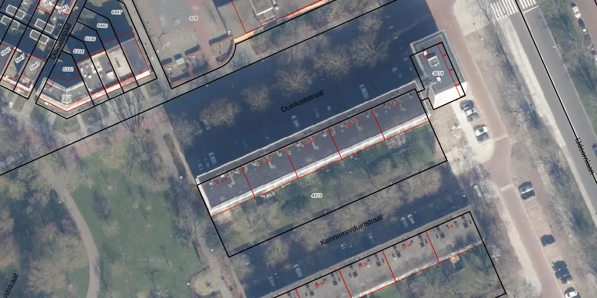 Het perceel waarop Duinluststraat 141 staat heeft een oppervlakte van 2112 m². Dit is een zeer groot perceel. De perceeloppervlakte wordt geregistreerd door het Kadaster. Gedetailleerde informatie over de maten van dit perceel kunt u vinden in het rapport Kadastrale kaart met maatvoering van Duinluststraat 141.