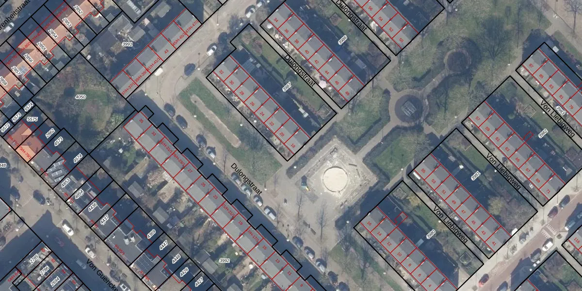 Het perceel waarop Dulongstraat 18 staat heeft een oppervlakte van 959 m². Dit is een groot perceel. De perceeloppervlakte wordt geregistreerd door het Kadaster. Gedetailleerde informatie over de maten van dit perceel kunt u vinden in het rapport Kadastrale kaart met maatvoering van Dulongstraat 18.