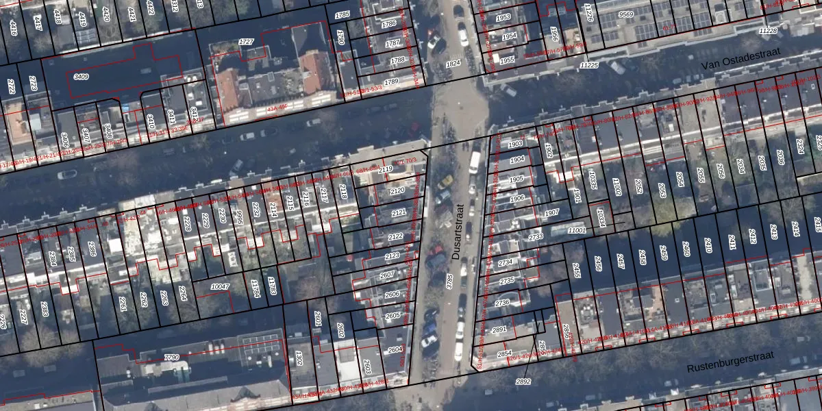 Dusartstraat 38-1 is gelegen op kadastraal perceel ASD18V2121. Deze kadastrale aanduiding is uniek en wordt gebruikt door het Kadaster om eigendomsrechten en andere zakelijke rechten vast te leggen. Het perceel maakt onderdeel uit van de kadastrale gemeente Amsterdam.