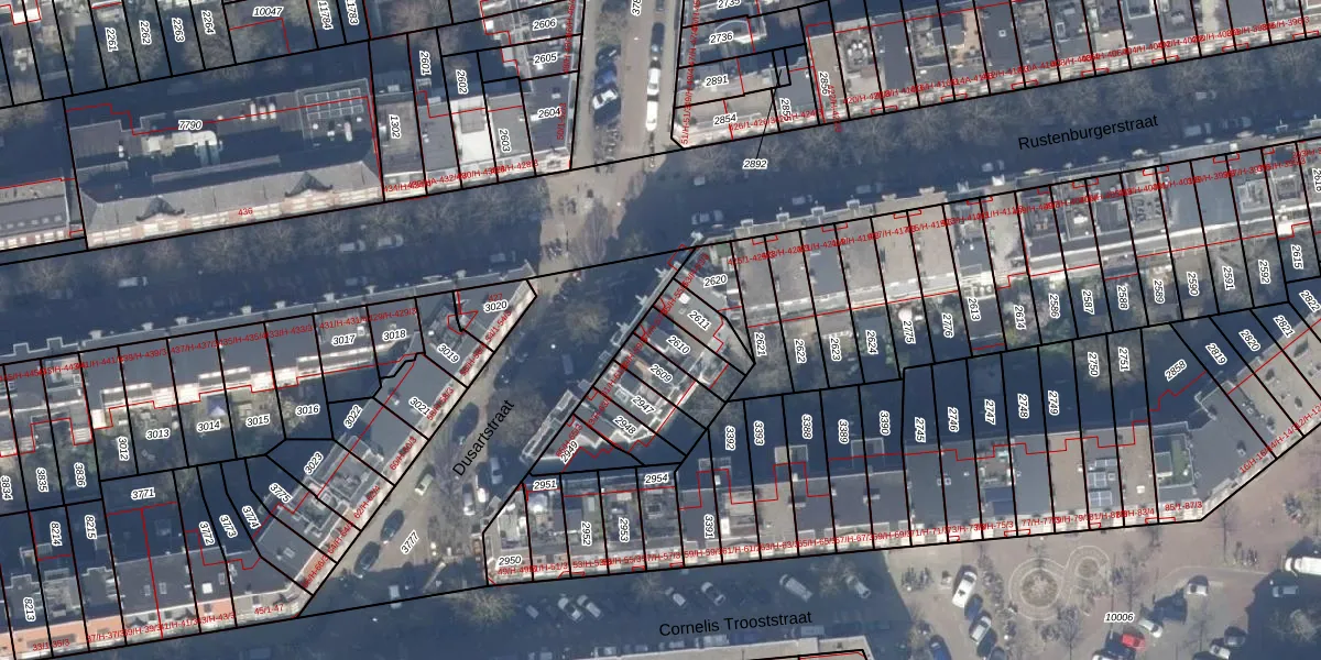 Het perceel waarop Dusartstraat 57-1 staat heeft een oppervlakte van 89 m². Dit is een klein perceel. De perceeloppervlakte wordt geregistreerd door het Kadaster. Gedetailleerde informatie over de maten van dit perceel kunt u vinden in het rapport Kadastrale kaart met maatvoering van Dusartstraat 57-1.