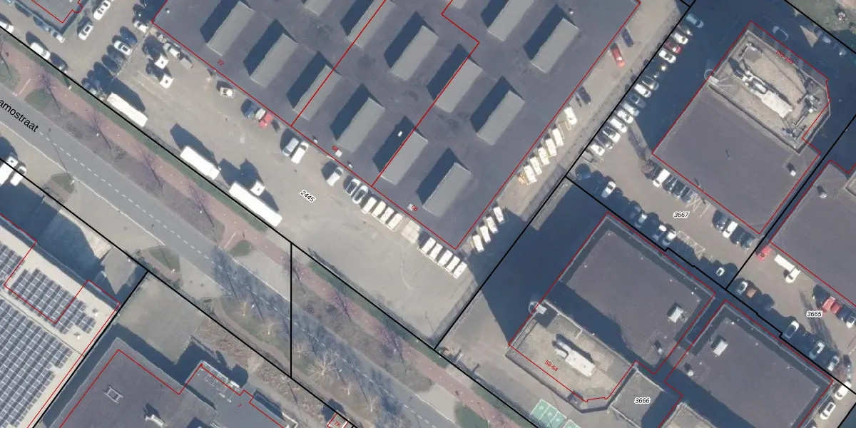 Het perceel waarop Dynamostraat 66 staat heeft een oppervlakte van 1,7 ha. Dit is een zeer groot perceel. De perceeloppervlakte wordt geregistreerd door het Kadaster. Gedetailleerde informatie over de maten van dit perceel kunt u vinden in het rapport Kadastrale kaart met maatvoering van Dynamostraat 66.