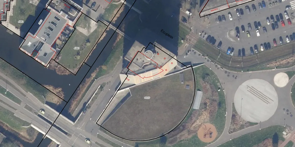 Het perceel waarop Ecuplein 65 staat heeft een oppervlakte van 2814 m². Dit is een zeer groot perceel. De perceeloppervlakte wordt geregistreerd door het Kadaster. Gedetailleerde informatie over de maten van dit perceel kunt u vinden in het rapport Kadastrale kaart met maatvoering van Ecuplein 65.