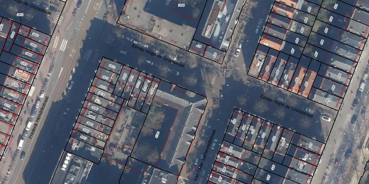 Het perceel waarop Eerste Hugo de Grootstraat 13-F-2 staat heeft een oppervlakte van 1260 m². Dit is een zeer groot perceel. De perceeloppervlakte wordt geregistreerd door het Kadaster. Gedetailleerde informatie over de maten van dit perceel kunt u vinden in het rapport Kadastrale kaart met maatvoering van Eerste Hugo de Grootstraat 13-F-2.