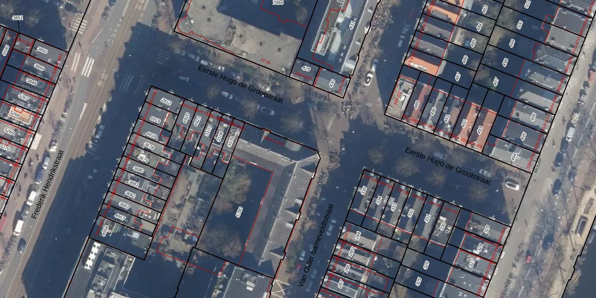 Eerste Hugo de Grootstraat 13-R-2 is gelegen op kadastraal perceel ASD13Q5780. Deze kadastrale aanduiding is uniek en wordt gebruikt door het Kadaster om eigendomsrechten en andere zakelijke rechten vast te leggen. Het perceel maakt onderdeel uit van de kadastrale gemeente Amsterdam.
