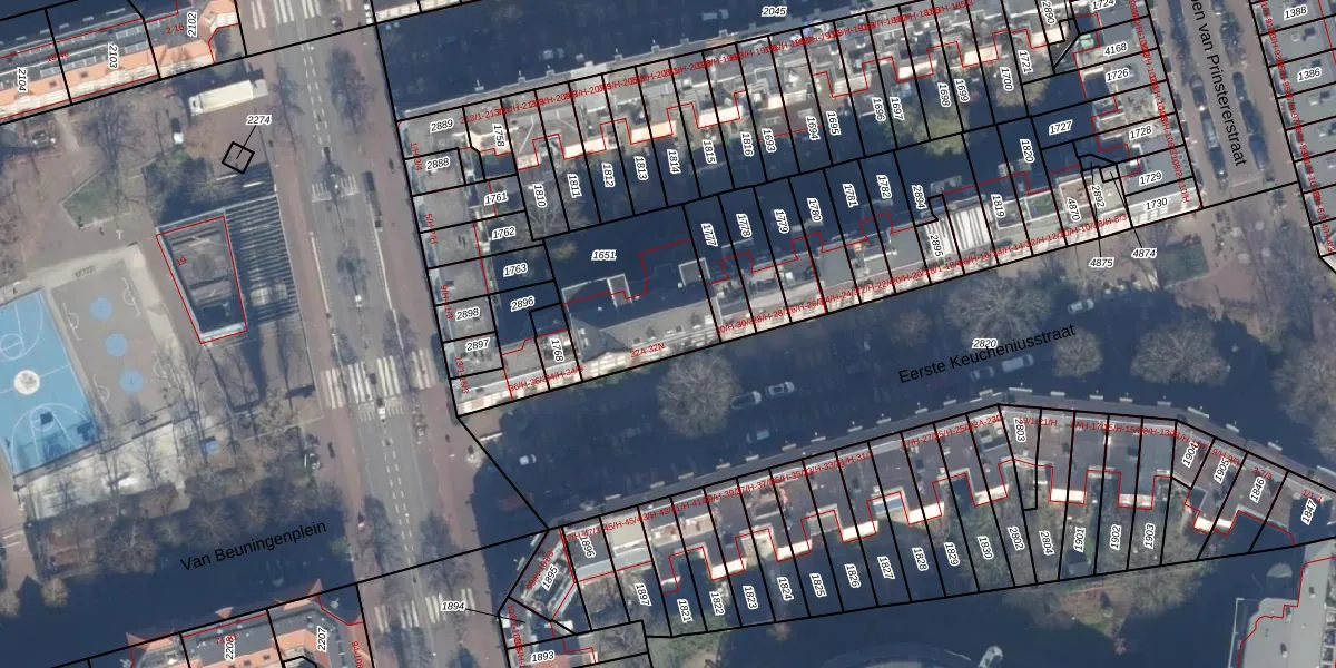 Het perceel waarop Eerste Keucheniusstraat 32-M staat heeft een oppervlakte van 470 m². Dit is een groot perceel. De perceeloppervlakte wordt geregistreerd door het Kadaster. Gedetailleerde informatie over de maten van dit perceel kunt u vinden in het rapport Kadastrale kaart met maatvoering van Eerste Keucheniusstraat 32-M.