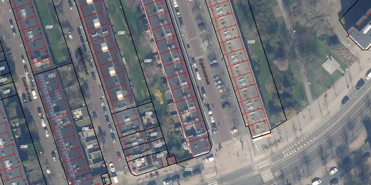 Het perceel waarop Egidiusstraat 101-3 staat heeft een oppervlakte van 2590 m². Dit is een zeer groot perceel. De perceeloppervlakte wordt geregistreerd door het Kadaster. Gedetailleerde informatie over de maten van dit perceel kunt u vinden in het rapport Kadastrale kaart met maatvoering van Egidiusstraat 101-3.