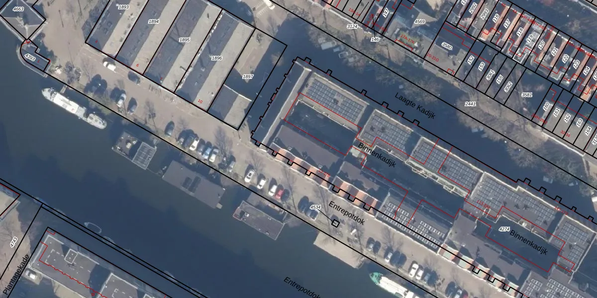 Het perceel waarop Entrepotdok 15-B staat heeft een oppervlakte van 7605 m². Dit is een zeer groot perceel. De perceeloppervlakte wordt geregistreerd door het Kadaster. Gedetailleerde informatie over de maten van dit perceel kunt u vinden in het rapport Kadastrale kaart met maatvoering van Entrepotdok 15-B.