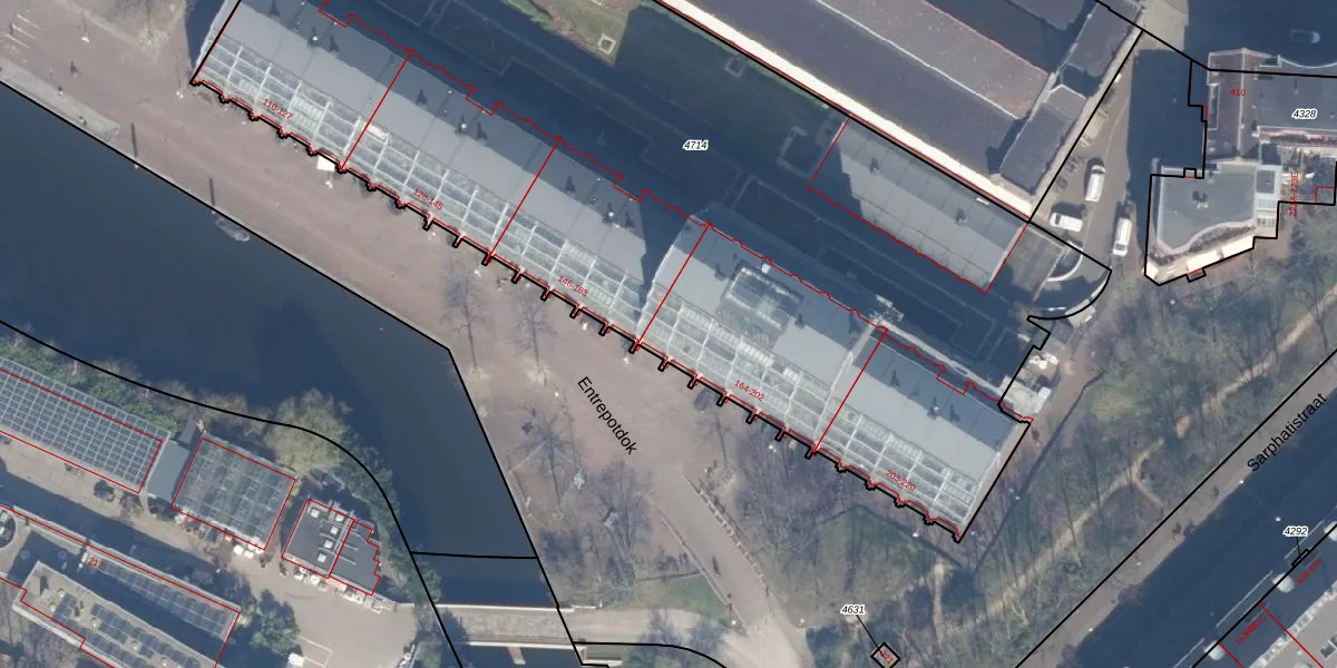 Het perceel waarop Entrepotdok 165 staat heeft een oppervlakte van 5978 m². Dit is een zeer groot perceel. De perceeloppervlakte wordt geregistreerd door het Kadaster. Gedetailleerde informatie over de maten van dit perceel kunt u vinden in het rapport Kadastrale kaart met maatvoering van Entrepotdok 165.