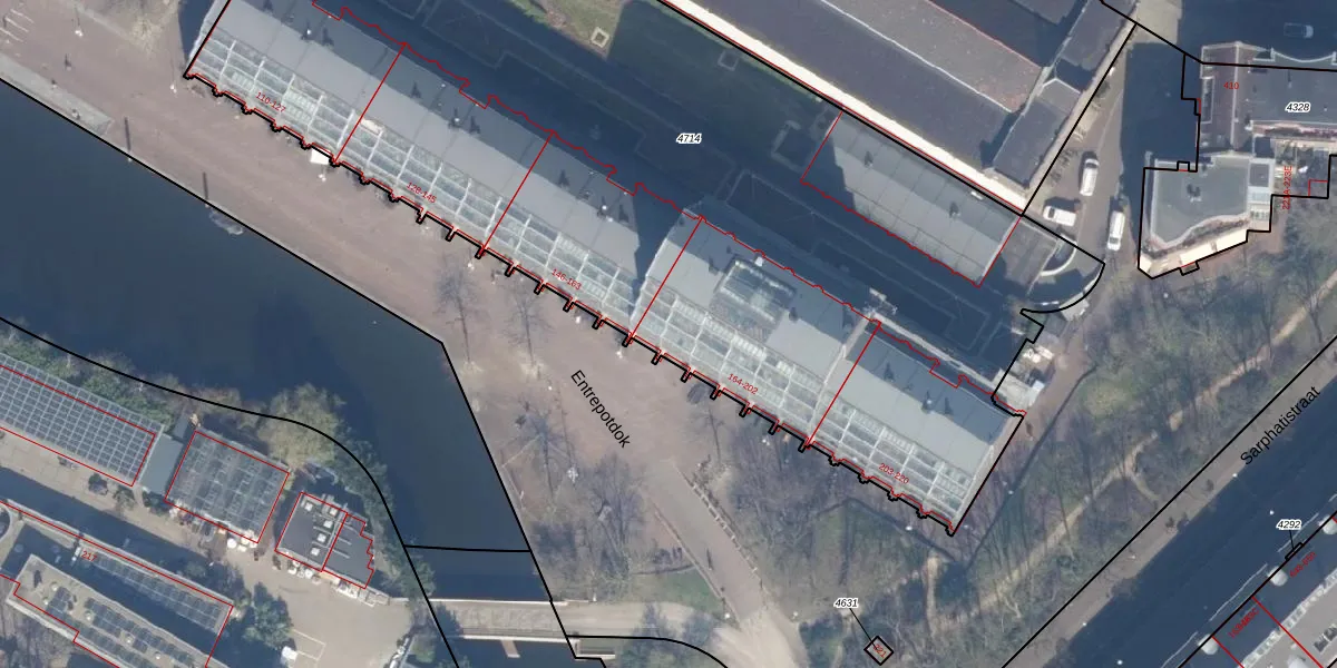 Het perceel waarop Entrepotdok 168 staat heeft een oppervlakte van 5978 m². Dit is een zeer groot perceel. De perceeloppervlakte wordt geregistreerd door het Kadaster. Gedetailleerde informatie over de maten van dit perceel kunt u vinden in het rapport Kadastrale kaart met maatvoering van Entrepotdok 168.