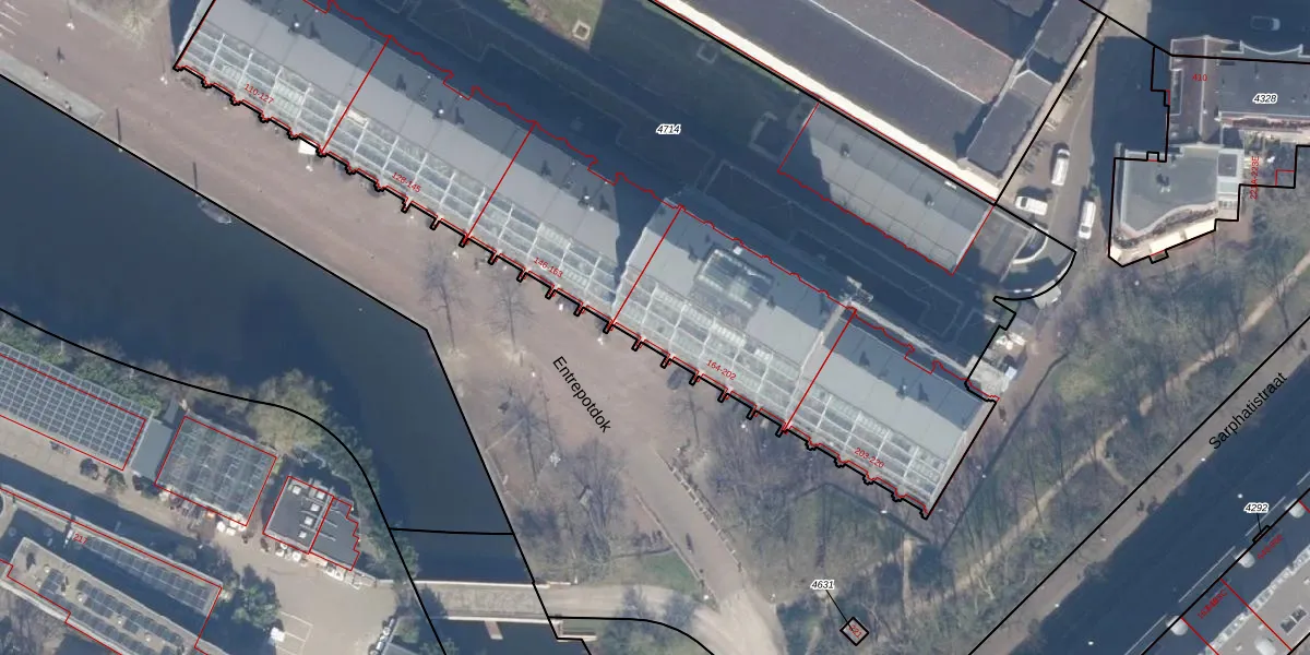 Het perceel waarop Entrepotdok 169 staat heeft een oppervlakte van 5978 m². Dit is een zeer groot perceel. De perceeloppervlakte wordt geregistreerd door het Kadaster. Gedetailleerde informatie over de maten van dit perceel kunt u vinden in het rapport Kadastrale kaart met maatvoering van Entrepotdok 169.
