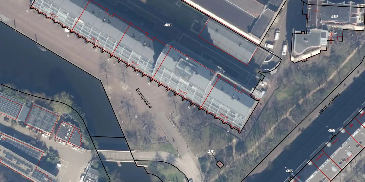 Het perceel waarop Entrepotdok 185 staat heeft een oppervlakte van 5978 m². Dit is een zeer groot perceel. De perceeloppervlakte wordt geregistreerd door het Kadaster. Gedetailleerde informatie over de maten van dit perceel kunt u vinden in het rapport Kadastrale kaart met maatvoering van Entrepotdok 185.